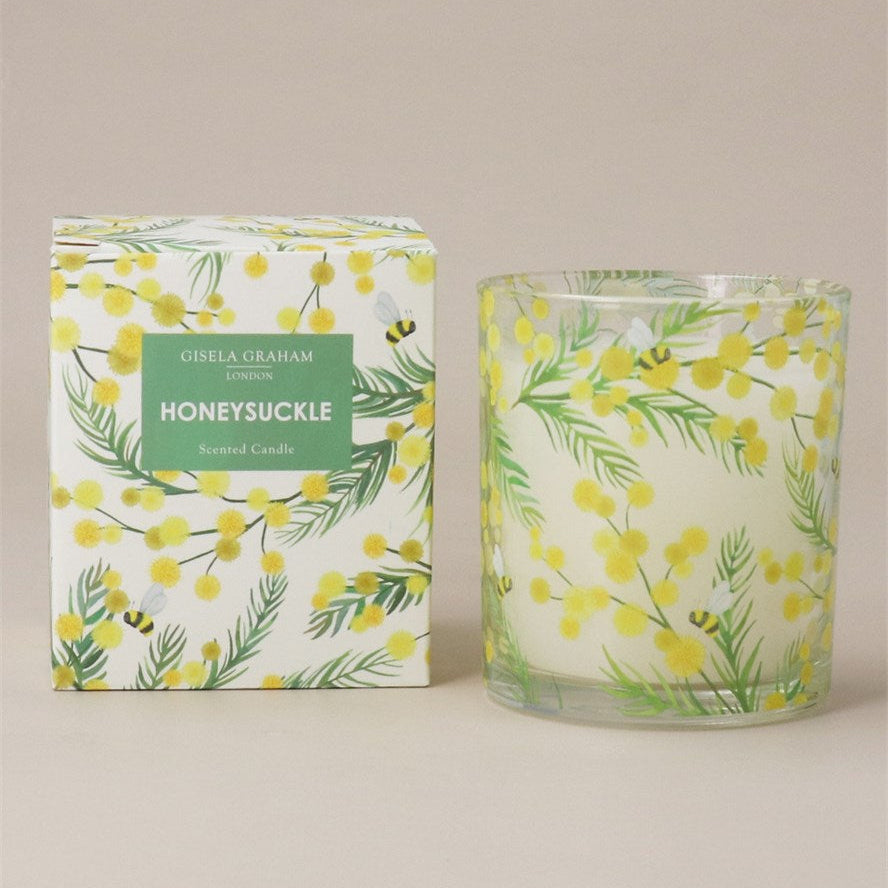 A stunning honeysuckle scented candle with a mimosa design