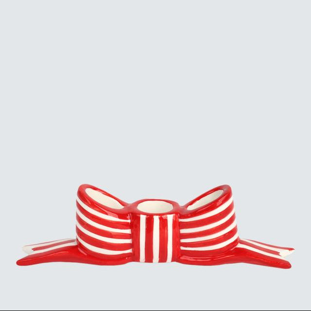 Featuring a sculptural ceramic bow shape in a striped finish, this elegant holder brings a touch of playful sophistication to any tablescape or mantle.