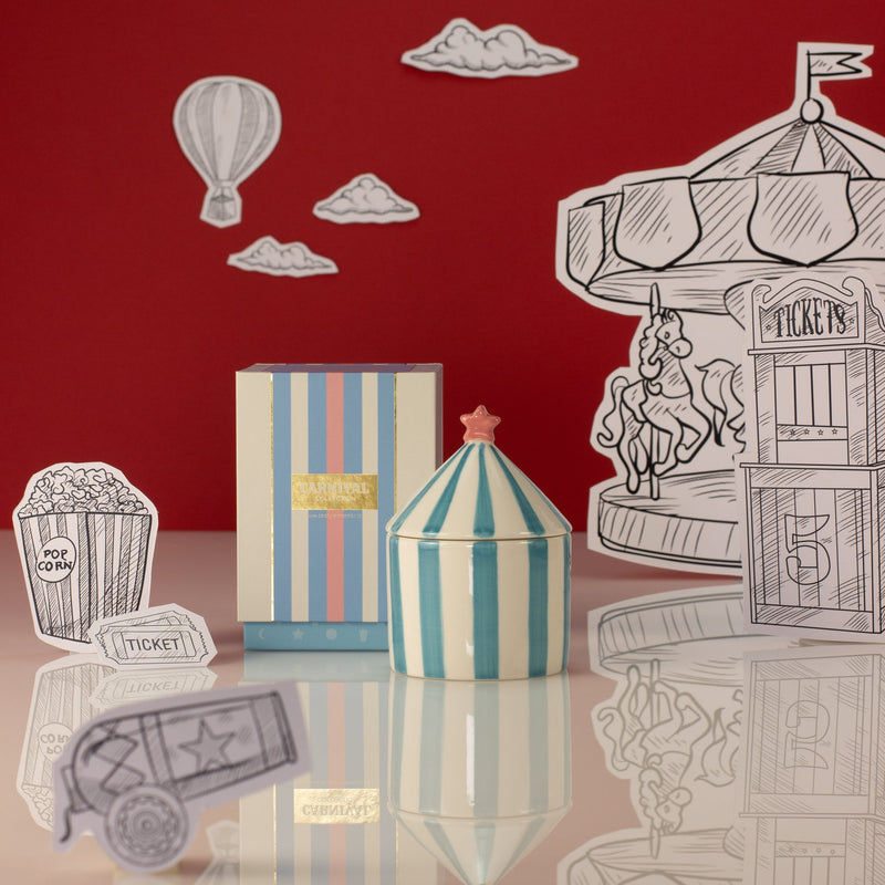 Housed in a striped ceramic vessel inspired by a classic circus tent, this candle with a lid brings playful charm with bold red stripes that elevate any space.