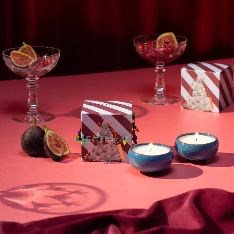 Each box contains two of our best-selling ceramic tea light vessels, filled with a cosy seasonal scent and designed to be repurposed long after the wax is gone. Presented in a playful 3D Christmas-themed gift box, containing artist illustrations and wrapped in a string of Christmas tree lights,  it’s a charming keepsake in itself - no wrapping required.