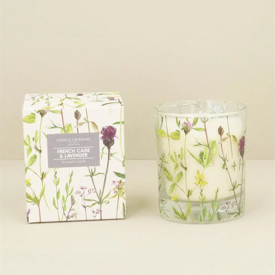 A beautiful French cade & lavender scented candle with a wild flowers design