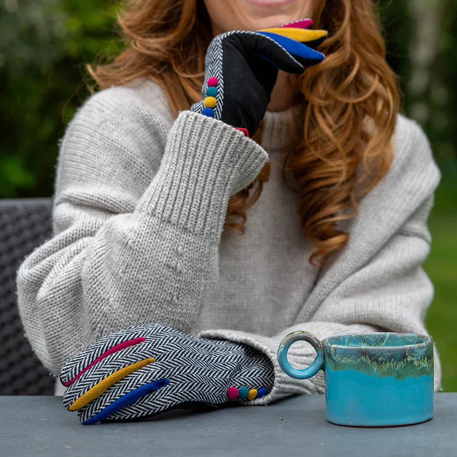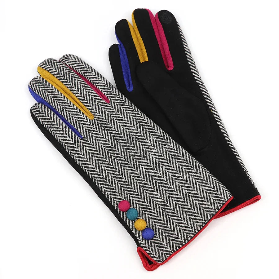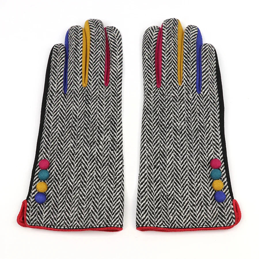 1 x Dark tweed and black faux suede gloves with colour contrast details and buttons from POM. One size. Materials: back : 100% polyester palm: 90% polyester, 10% elastane