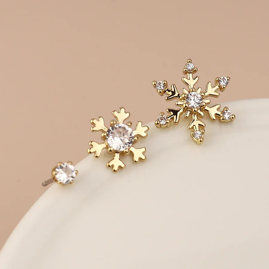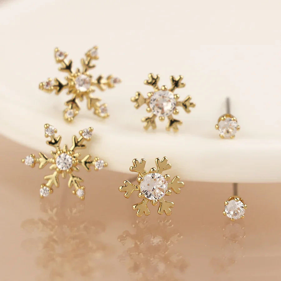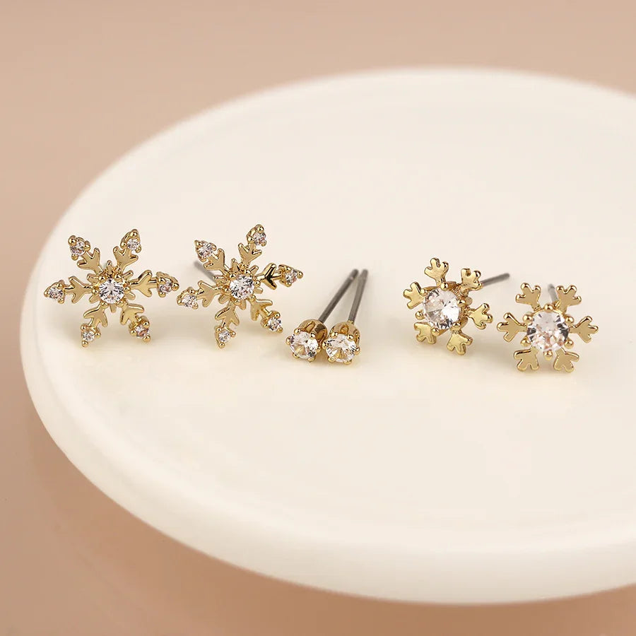 1 x Faux gold plated triple stud earring set with two pairs of crystal snowflakes and one classic crystal pair from POM. Approximate sizes 12mm, 10mm, 3mm