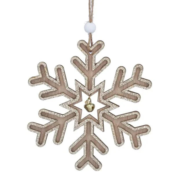1 x A gorgeous snowflake with gold trim wood hanging decoration from Gisela Graham. A simple, yet stylish addition to any tree. Dimensions: 12cm x 12cm x 1cm. Made from Wood