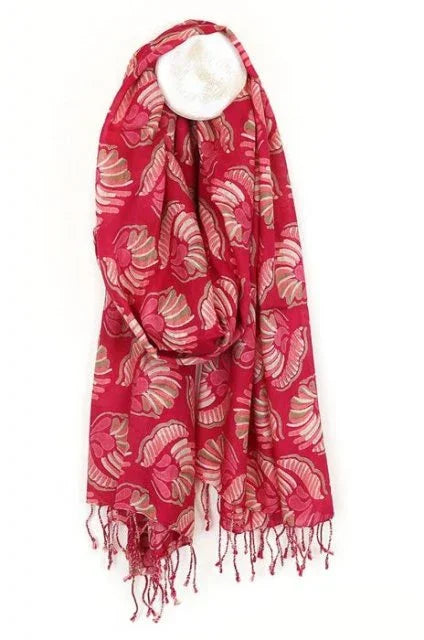 POM - Carmine Red Shell Print Modal Scarf with Fringe Trim