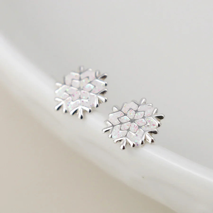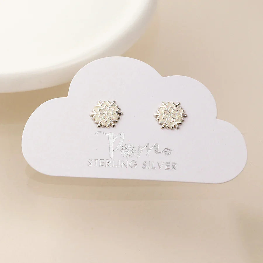 1 x Sterling silver glitter snowflake stud earrings from POM with white glitter enamel. Approximate size 9mm.