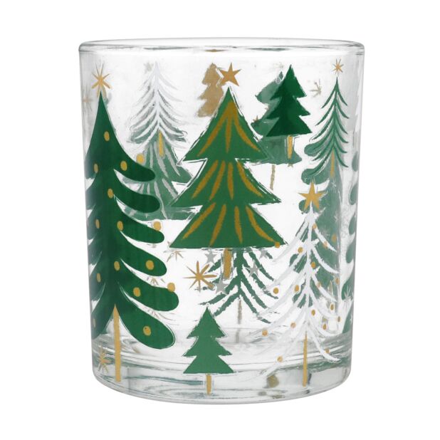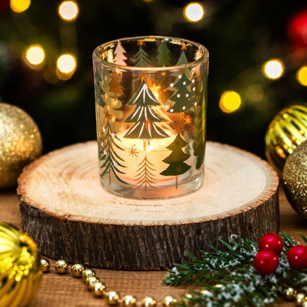Simply place a tea light in the holder and watch as your home is filled with the soft glow of candlelight. This elegant decorative piece features clear glass embellished with a scene filled with festive Christmas trees with gold accents. Place it on a shelf or mantelpiece to admire it all winter long.