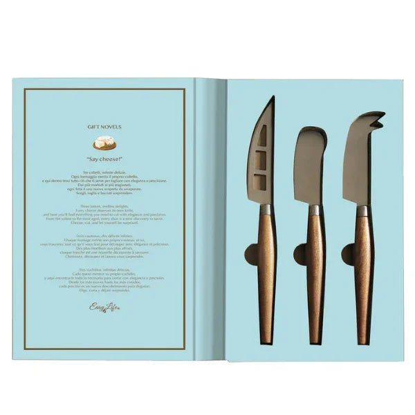 Elegant cheese themed novel gift set in a book-style box titled “Say Cheese”, featuring a trio of cheese knives.