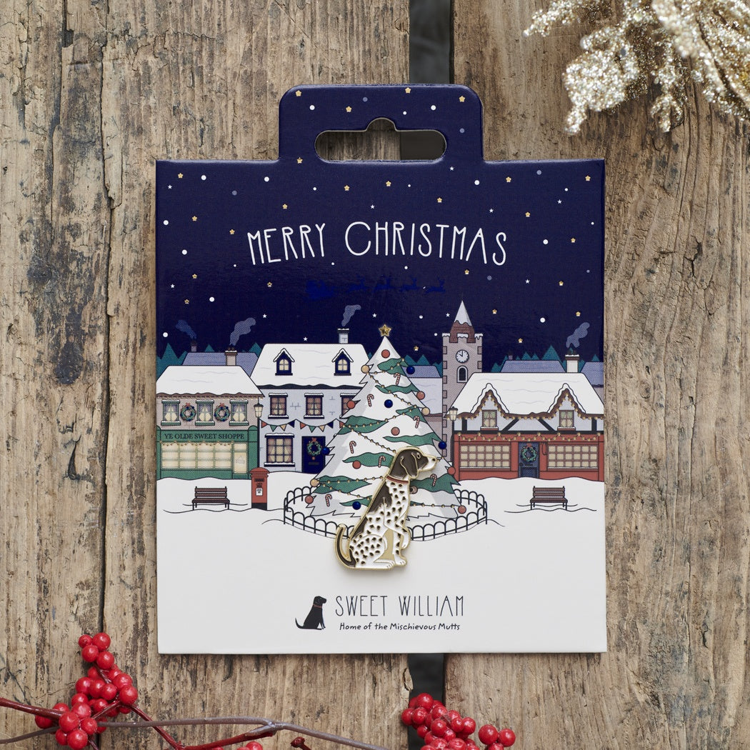 Your pin will arrive on a sturdy backing card depicting a typical British village at Christmas. Perfect as stocking fillers, secret santa gifts or send instead of, or with, a dog lover's Christmas card.
