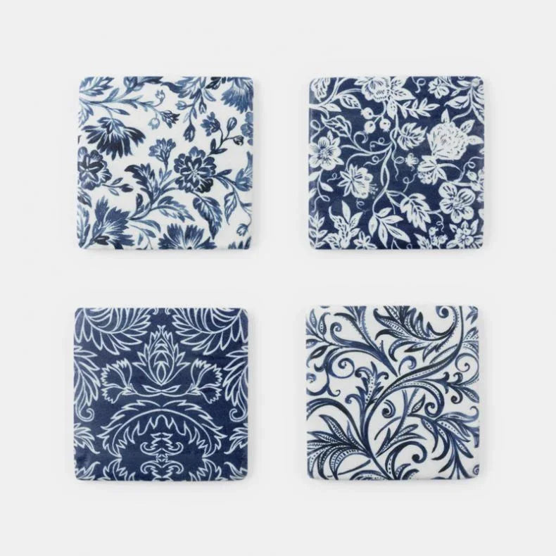 A beautiful set of four resin coasters with indigo wallpaper design from Gisela Graham