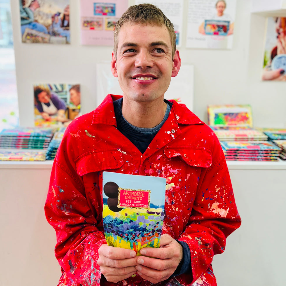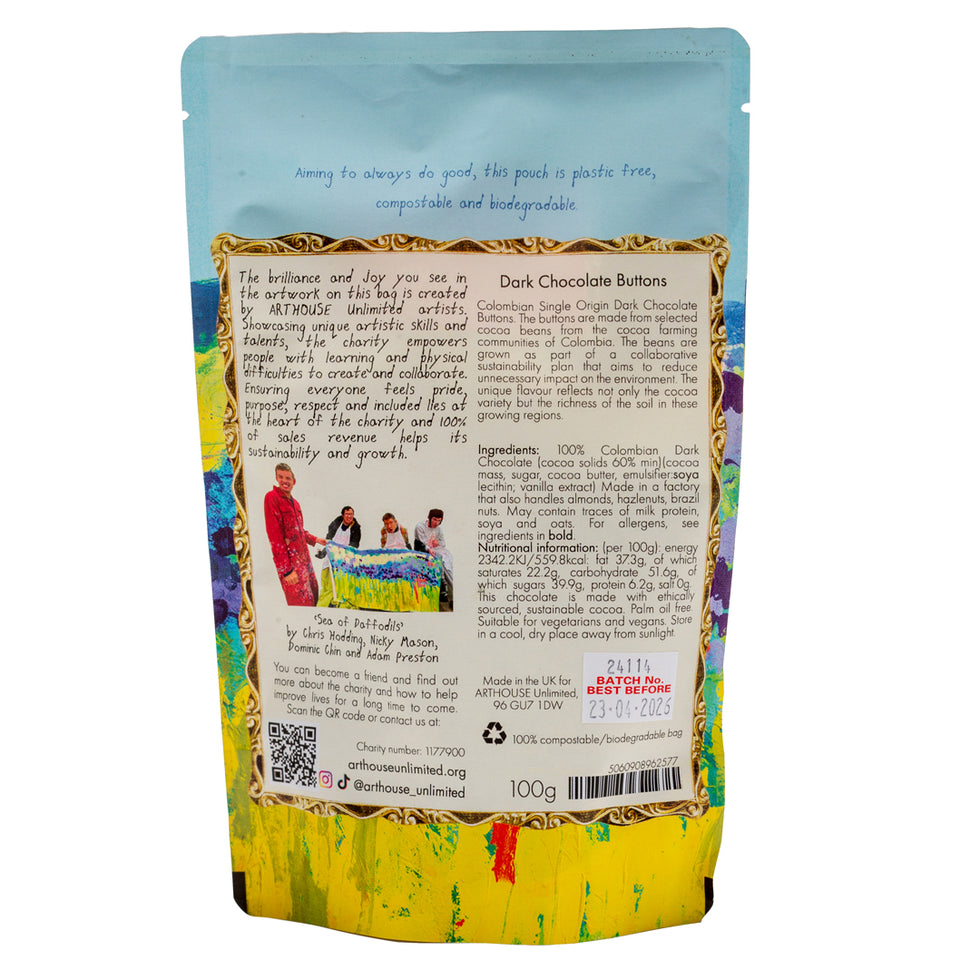 Made in the UK with responsibly sourced cocoa and encased in a compostable and biodegradable pouch, these buttons feature the artwork, Sea of Daffodils by a group of ARTHOUSE Unlimited artists.