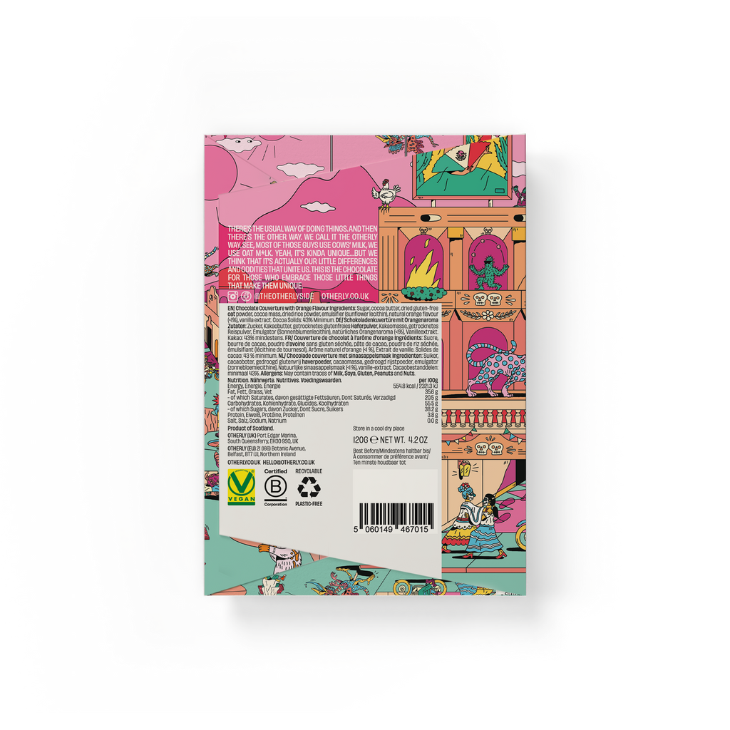 Got a thing for citrus with a side of chaos? Our Orange Oatm*lk bar is a sweet little zing-fest – silky oatm*lk chocolate stirred up with a splash of orange essential oil and a whole lotta Otherly charm. It’s smooth, it’s slightly tangy, and it leaves your taste buds doing a happy little dance long after the last bite.