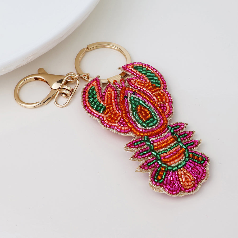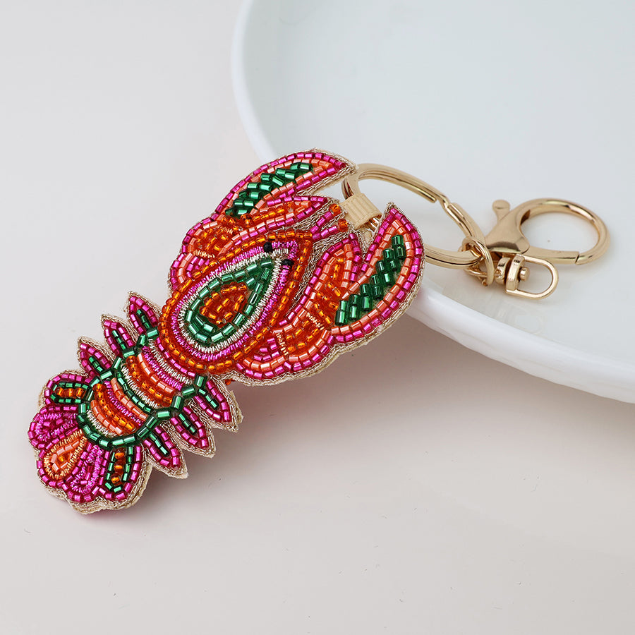 Embellished lobster bag charm and keyring with beads in jade green, orange and pink on a golden keyring with lobster clasp