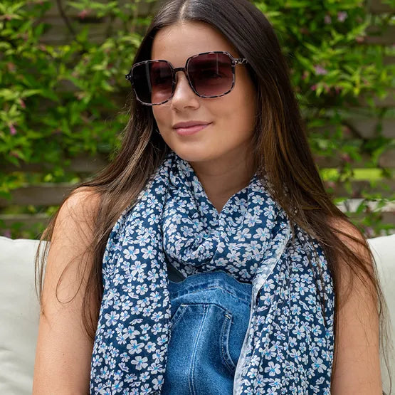 Navy modal scarf with ditsy floral print in white and green, featuring a smooth, lightweight feel that is comfortable to wear all day and easy to style in multiple ways.