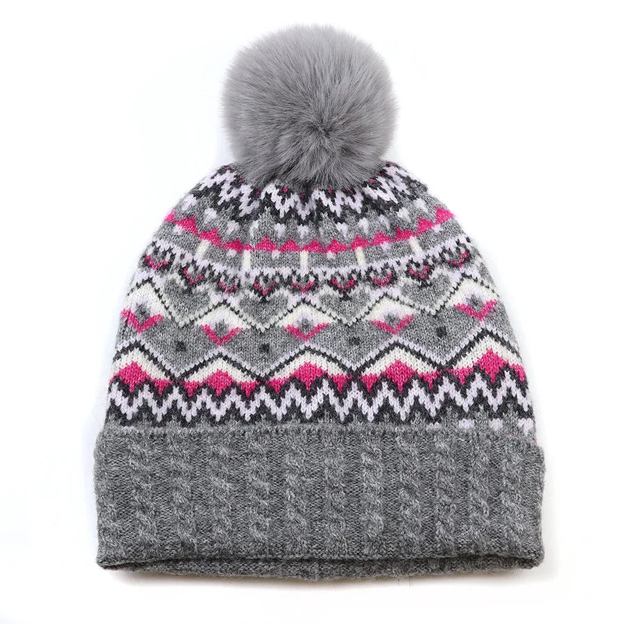 The POM Grey Mix Fair Isle Bobble Hat combines traditional winter style with a modern, sustainable twist.