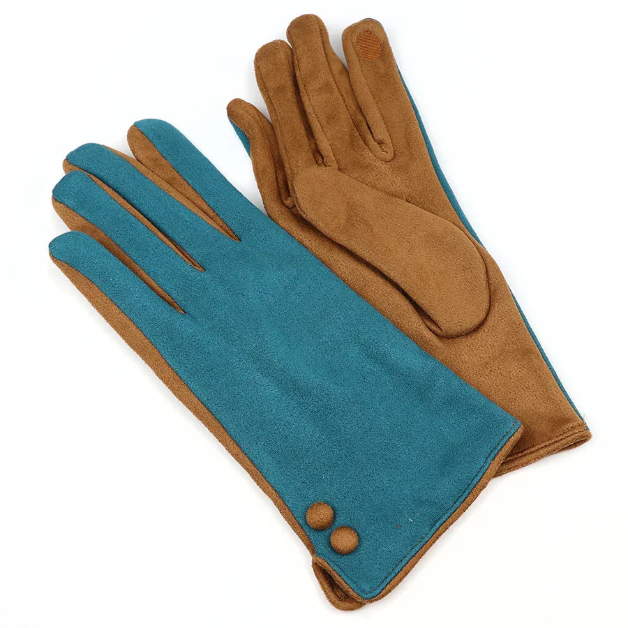 Teal blue and tan contrast faux suede gloves with button cuffs