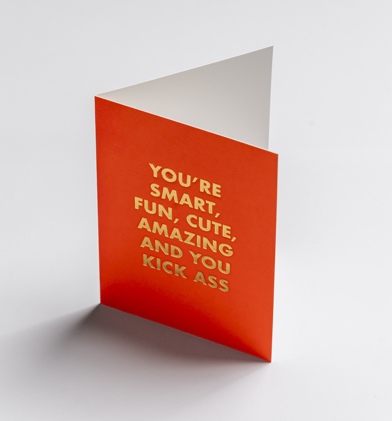 1 x You're Smart, Fun, Cute, Amazing, and You Kick Ass Mini Card from Lagom which are distinguishable by their quality and attention to detail. Dimensions: W90 x H120 mm. Sustainably sourced 350gsm thick board. Hand embossed with recyclable foil. Blank inside for your own message.