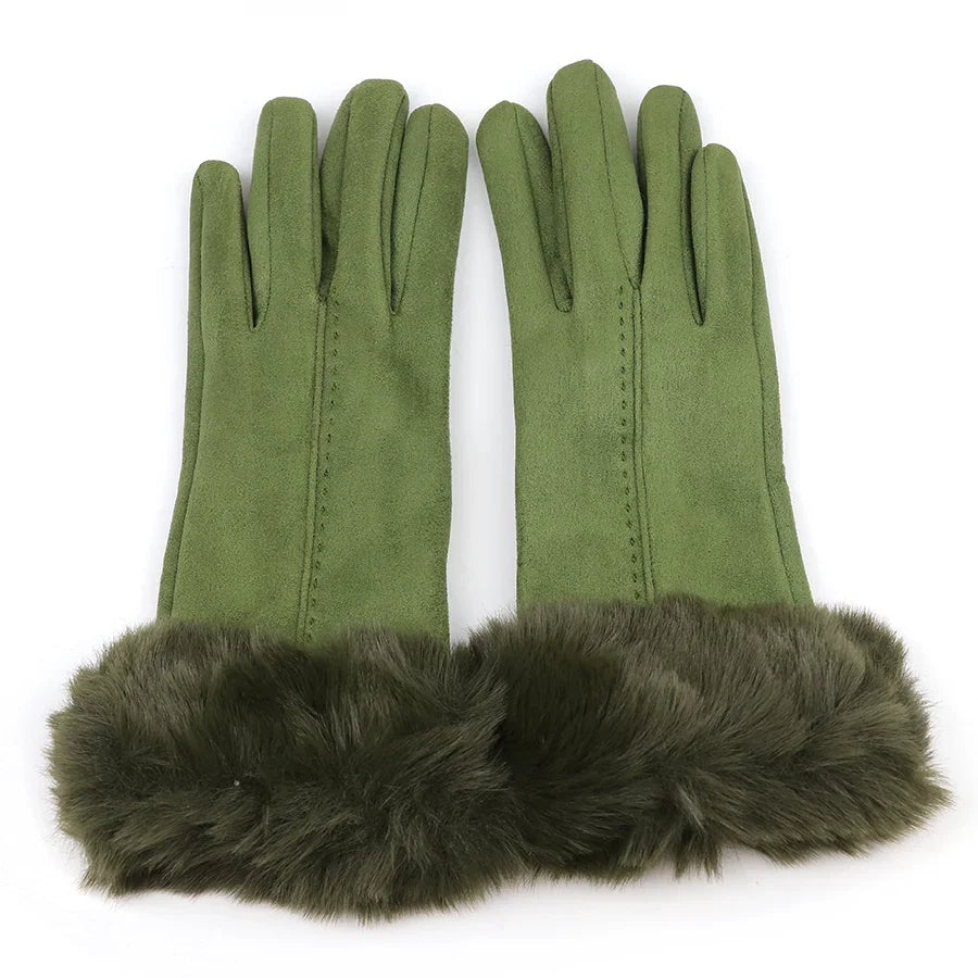 Faux suede gloves in olive with matching faux fur wrist cuff