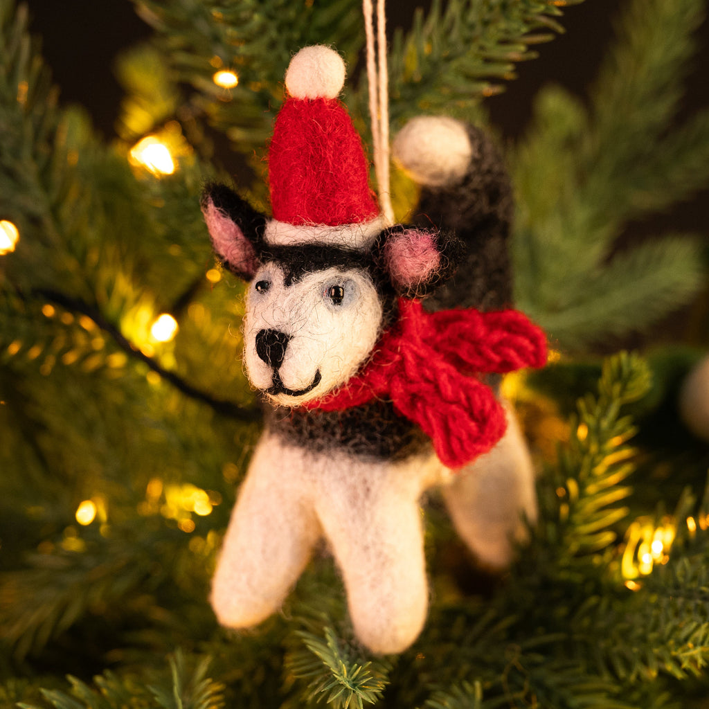 A beautiful husky dog wrapped up against the cold ready to add a polar feel to your Christmas tree. Comes with a hanging loop and can stand alone.